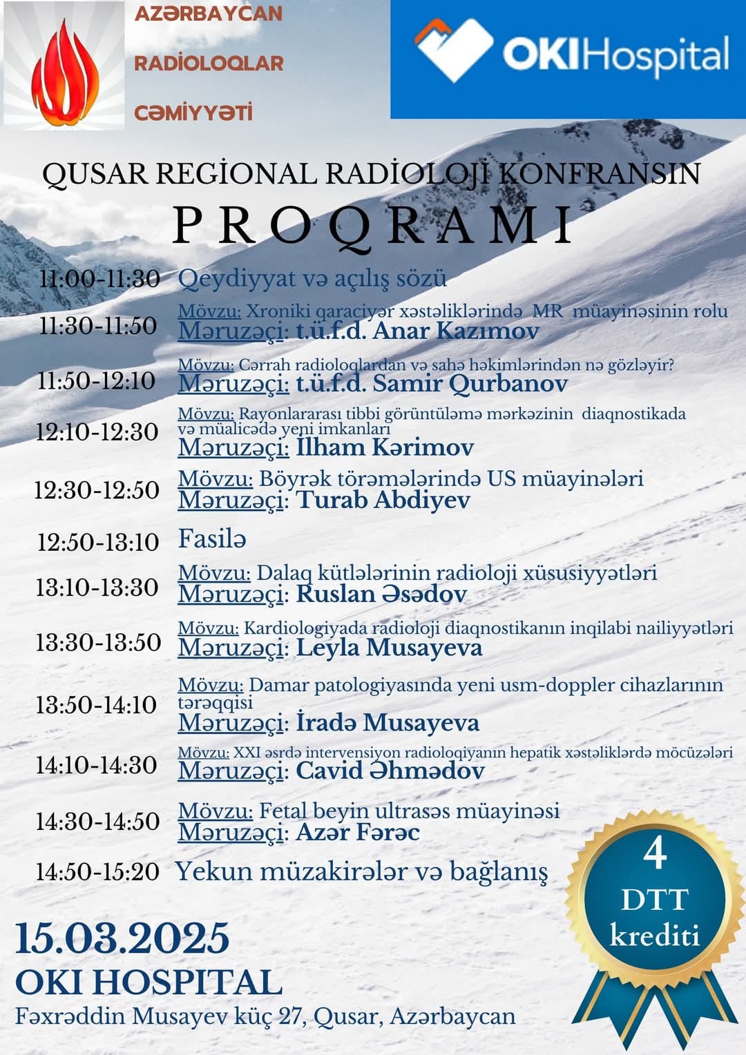The Qusar Regional Radiology Conference was successfully held on March 15, 2025, at OKI Hospital in Qusar. Experts discussed key topics such as MRI in liver diseases, advancements in ultrasound and Doppler technologies, and interventional radiology in hepatic conditions. The event fostered professional exchange and regional collaboration in radiology.